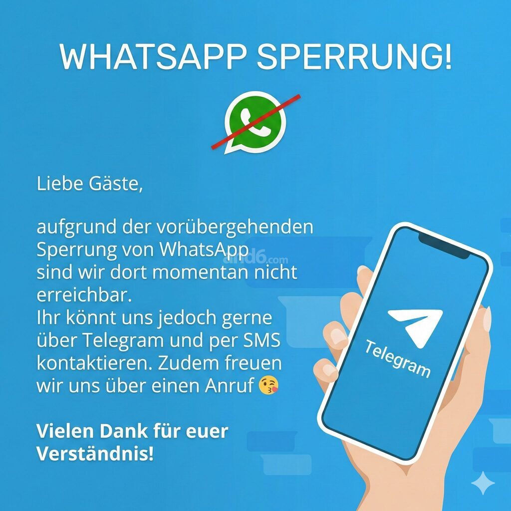 aufgrund der vorübergehenden Sperrung von Whatsapp sind wir dort momentan nicht erreichbar.